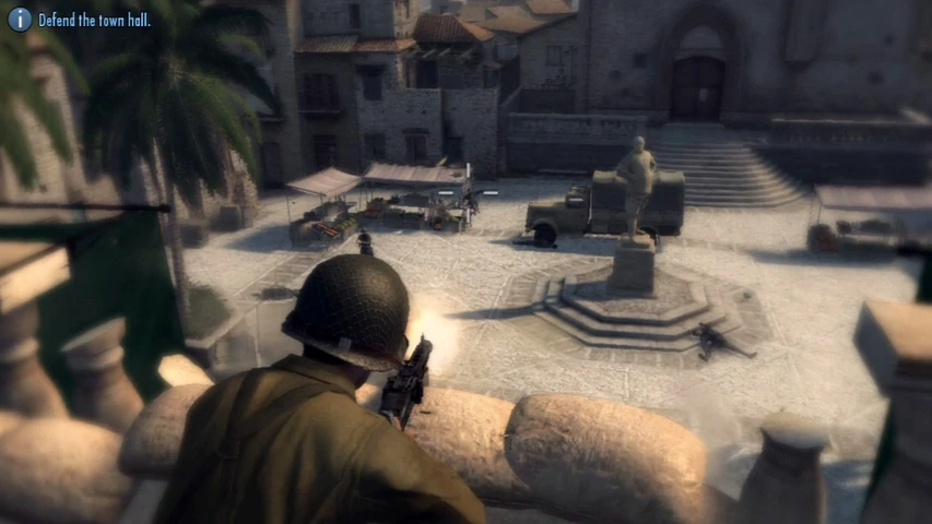 As the town's citizens are about to be executed, Vito and his squad overtake the Italians and storm the town hall to rescue the remaining prisoners. They quickly learn there are more soldiers on the way, so as soon as they clear the building, they use it as cover to take out the approaching men.